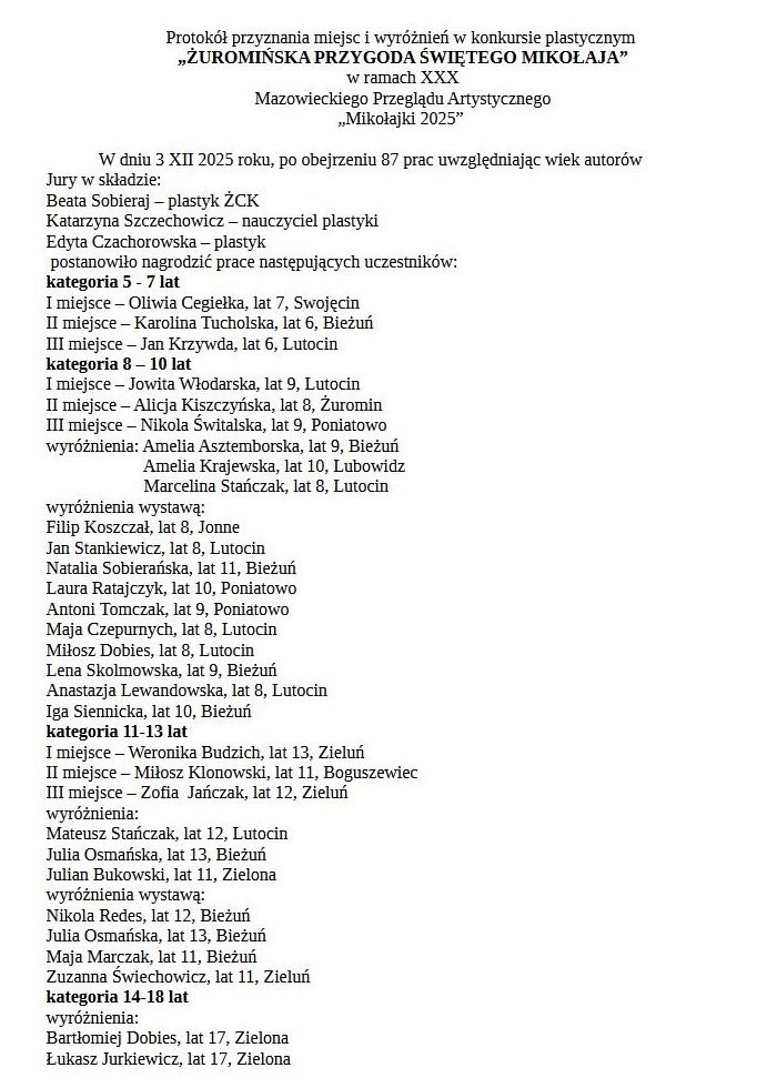 Wręczenie nagród w konkursie plastycznym "Żuromińska przygoda Św Mikołaja".