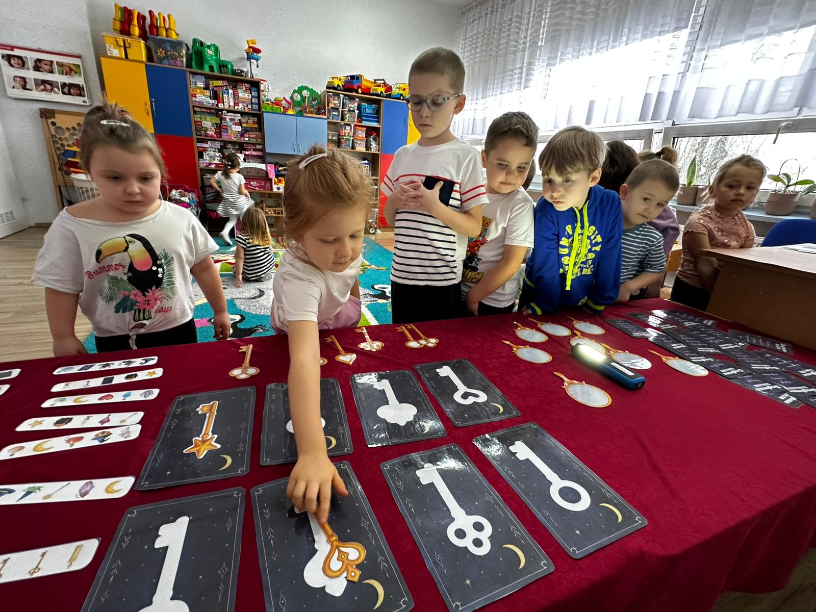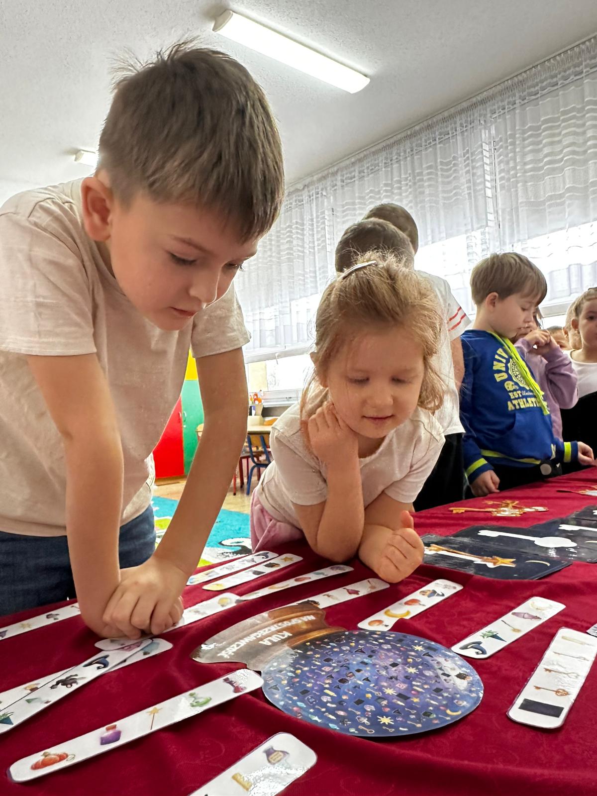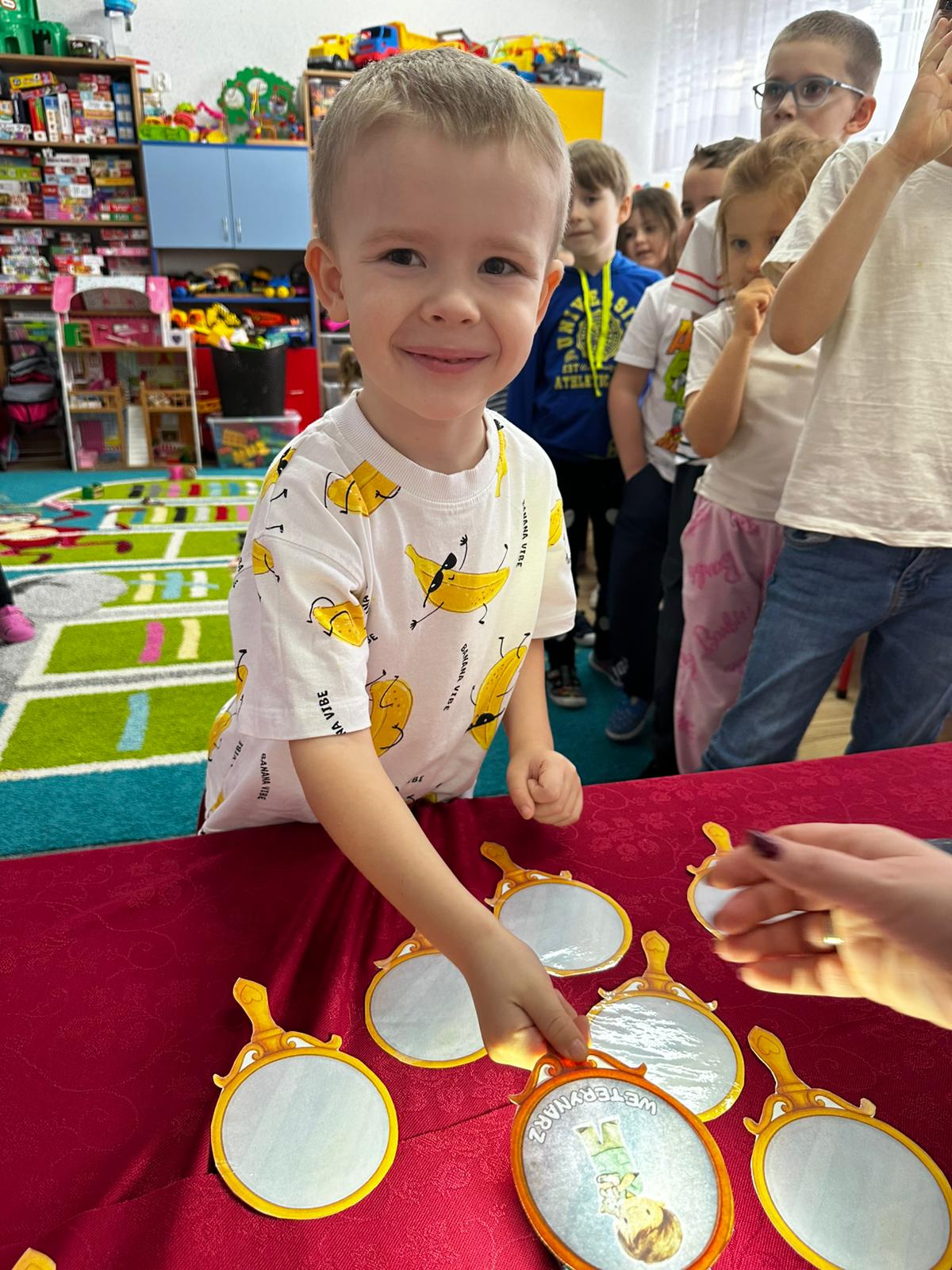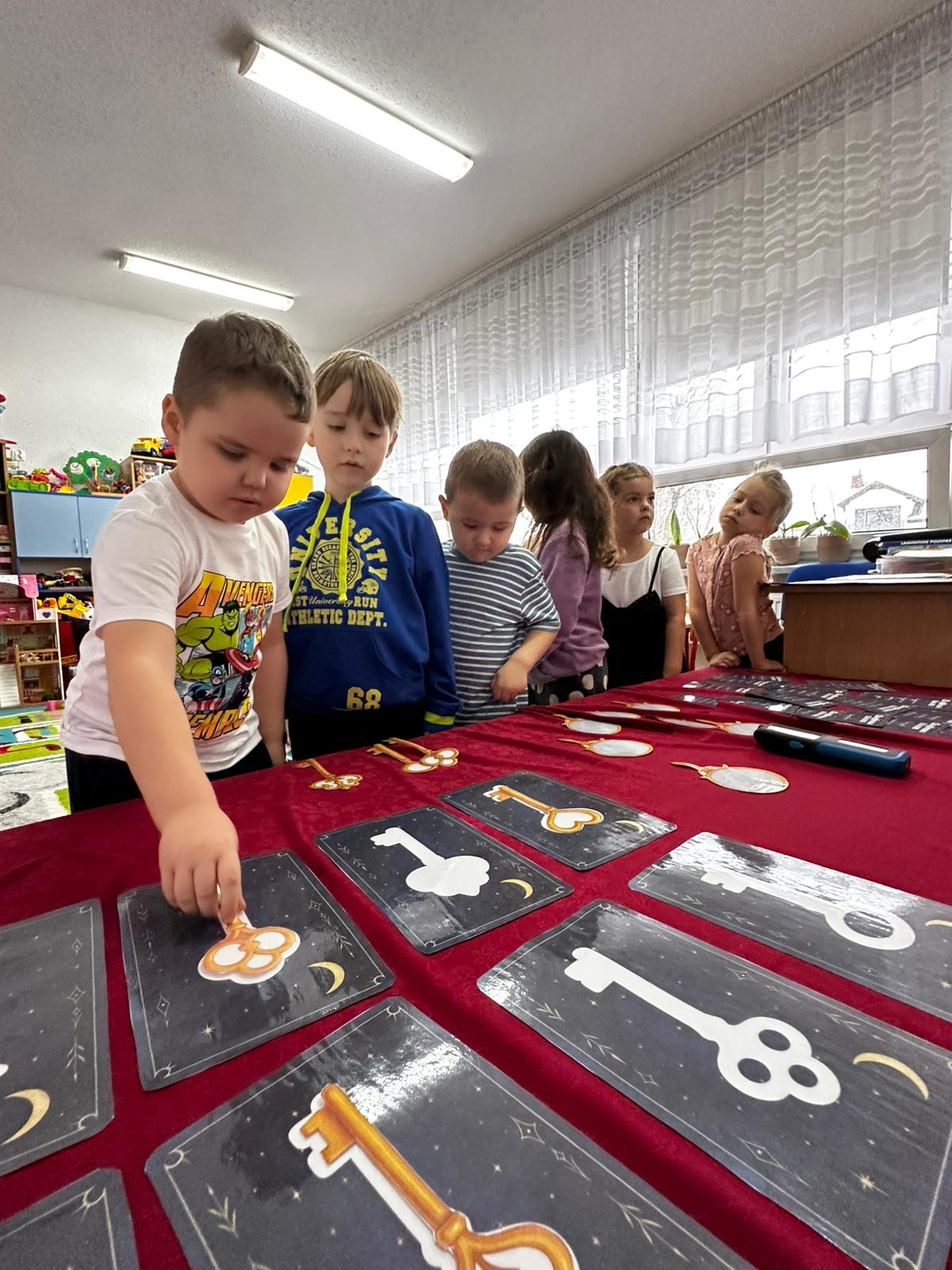 Dzieci wróżyły przyszłe zawody, zaglądając do magicznego lusterka, a następnie wykonywały zadania z tajemniczych kart, które prowadziły je przez kolejne etapy zabawy. Nie zabrakło również dopasowywania kluczy do właściwych drzwi, co wzbudziło wiele emocji i śmiechu. Był to dzień pełen radości, ciekawości i wspólnej zabawy. Dziękujemy dzieciom za zaangażowanie, a rodzicom za pomoc w przygotowaniu słodkiego poczęstunku!