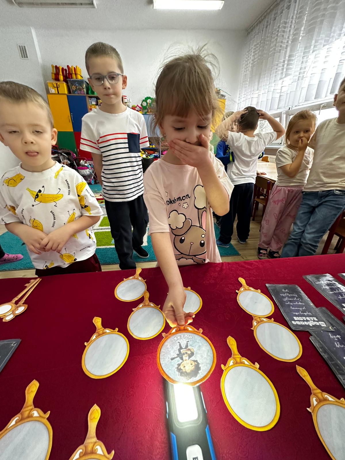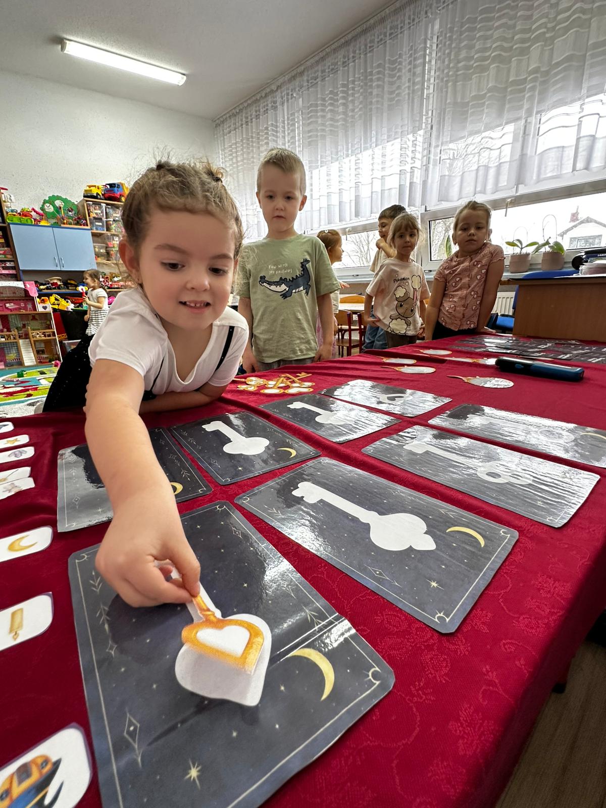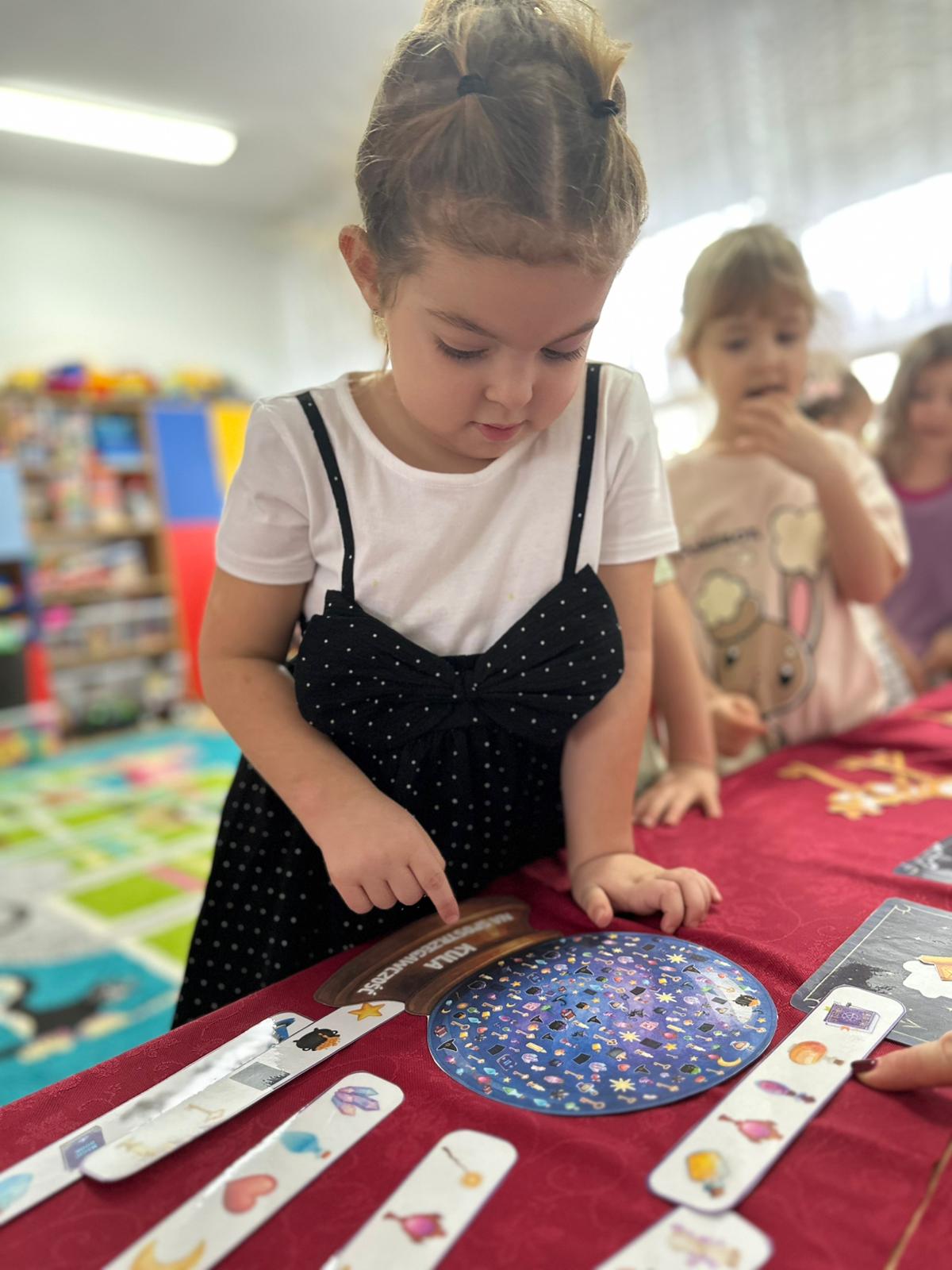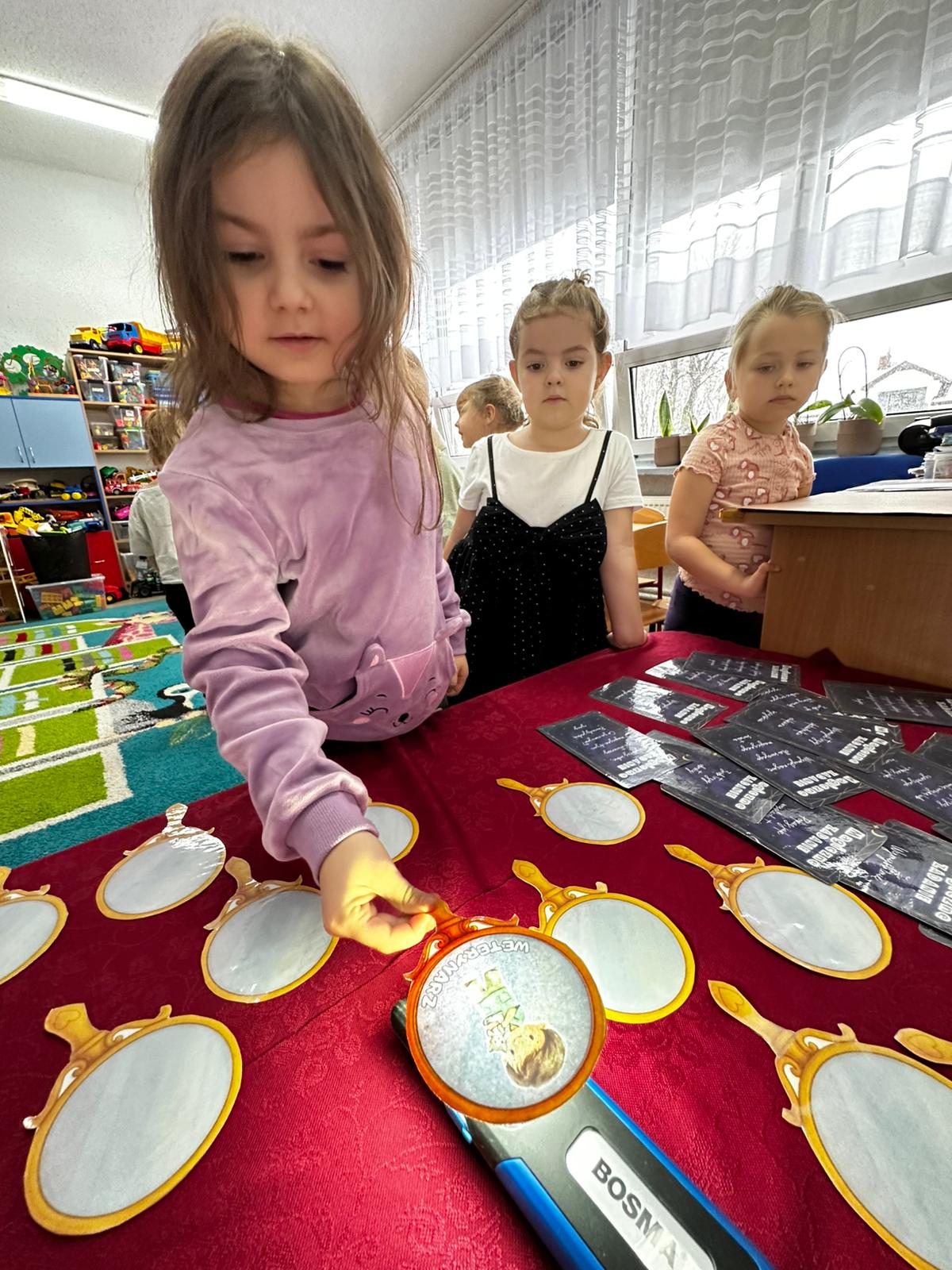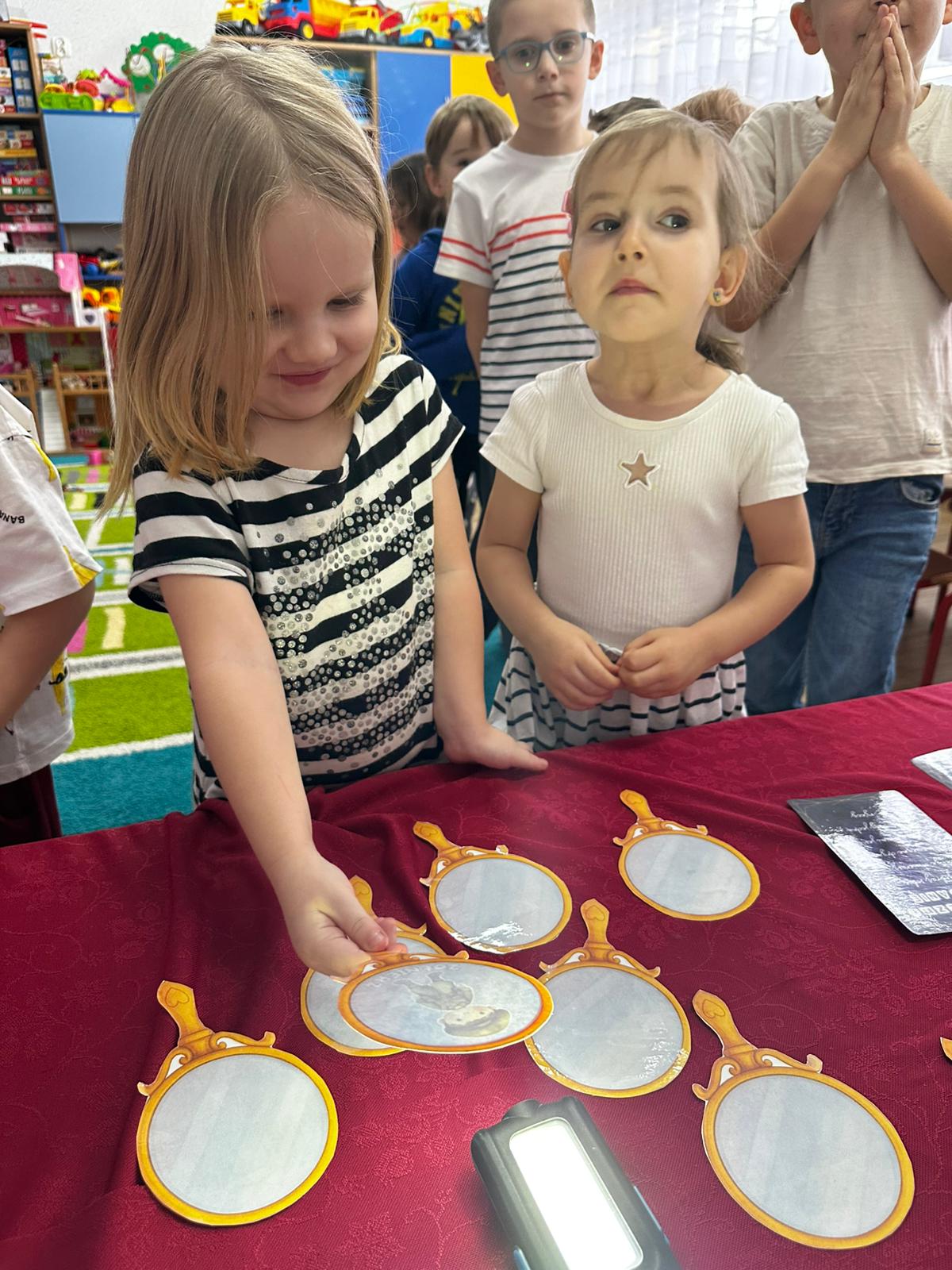 Dzieci wróżyły przyszłe zawody, zaglądając do magicznego lusterka, a następnie wykonywały zadania z tajemniczych kart, które prowadziły je przez kolejne etapy zabawy. Nie zabrakło również dopasowywania kluczy do właściwych drzwi, co wzbudziło wiele emocji i śmiechu. Był to dzień pełen radości, ciekawości i wspólnej zabawy. Dziękujemy dzieciom za zaangażowanie, a rodzicom za pomoc w przygotowaniu słodkiego poczęstunku!