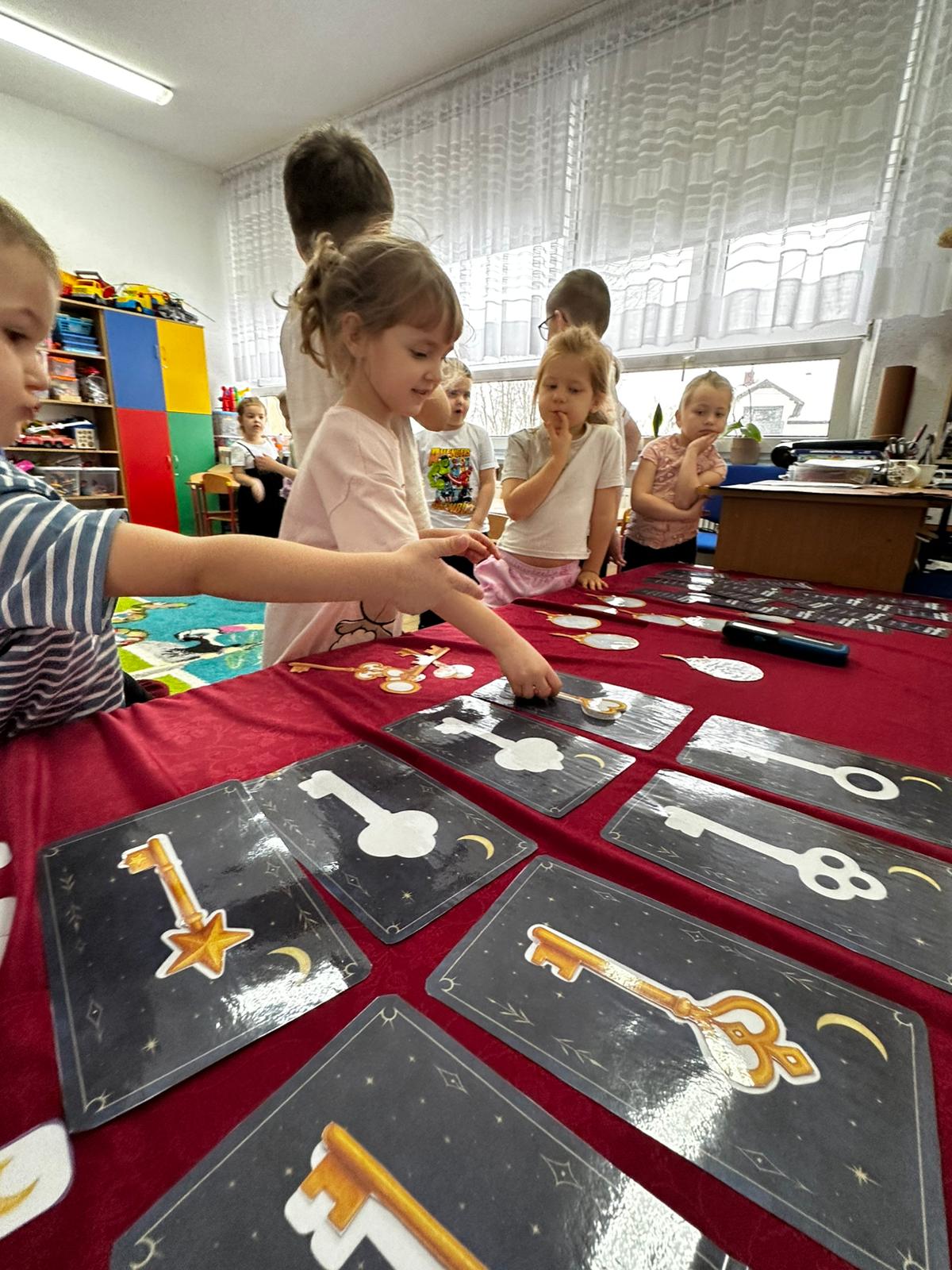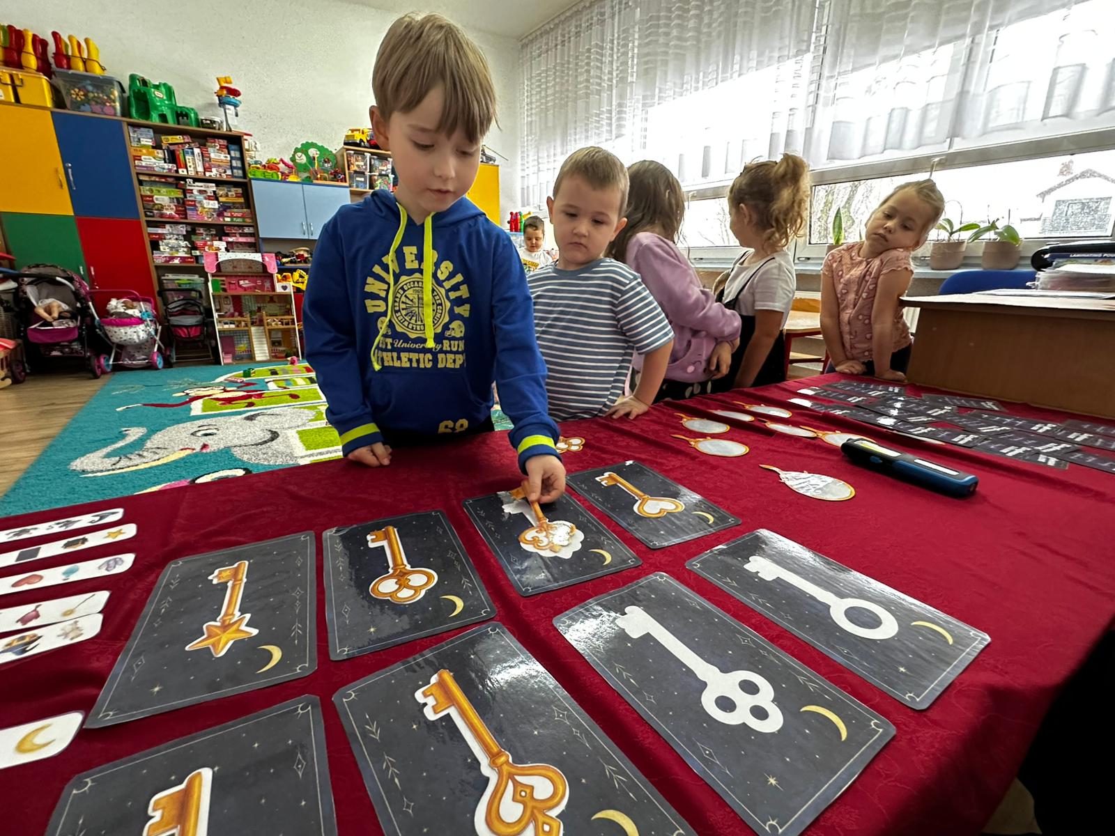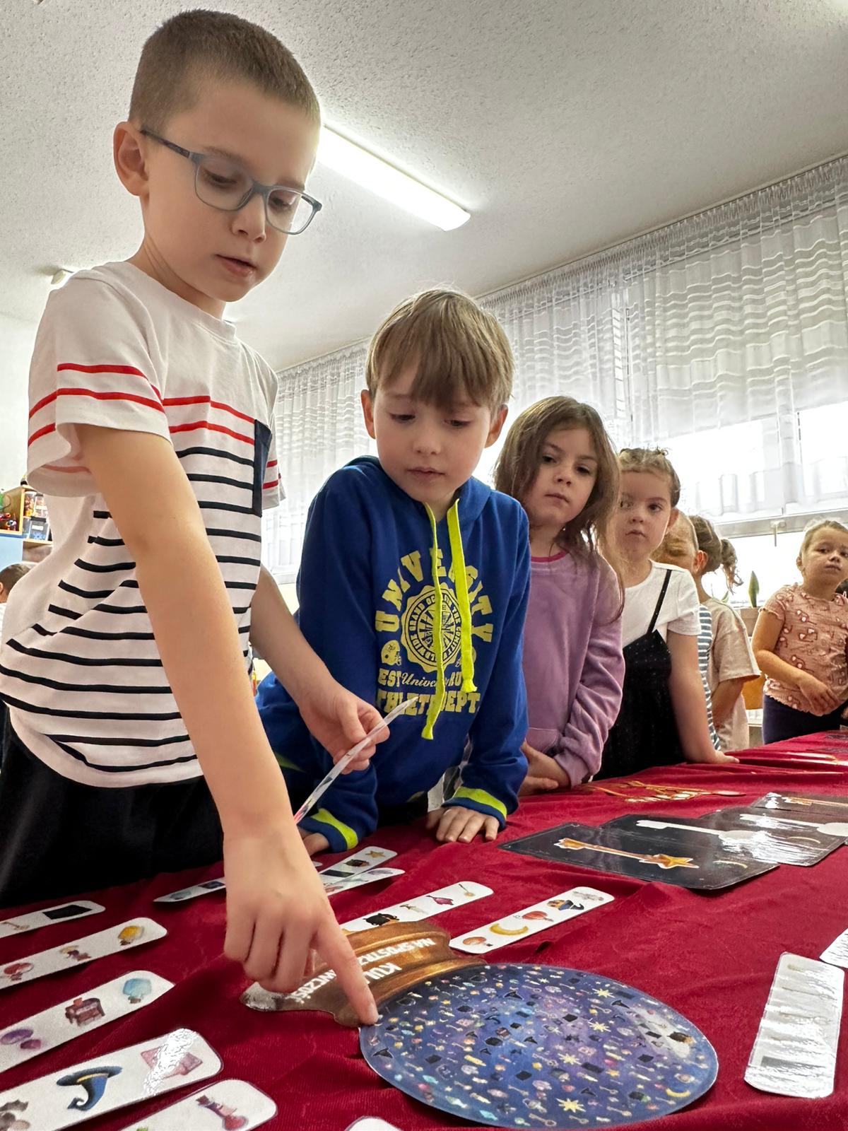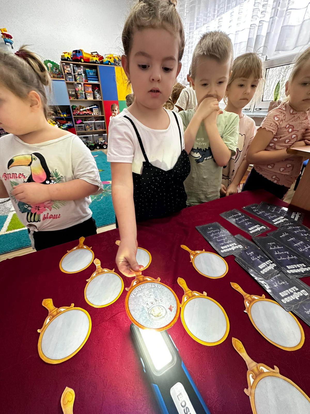 Dzieci wróżyły przyszłe zawody, zaglądając do magicznego lusterka, a następnie wykonywały zadania z tajemniczych kart, które prowadziły je przez kolejne etapy zabawy. Nie zabrakło również dopasowywania kluczy do właściwych drzwi, co wzbudziło wiele emocji i śmiechu. Był to dzień pełen radości, ciekawości i wspólnej zabawy. Dziękujemy dzieciom za zaangażowanie, a rodzicom za pomoc w przygotowaniu słodkiego poczęstunku!