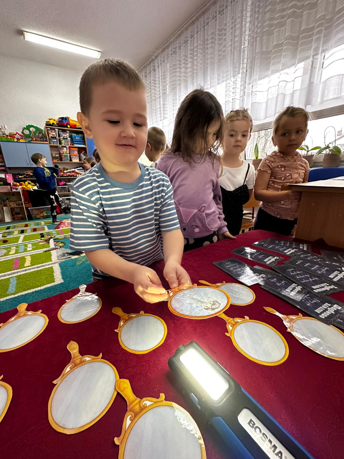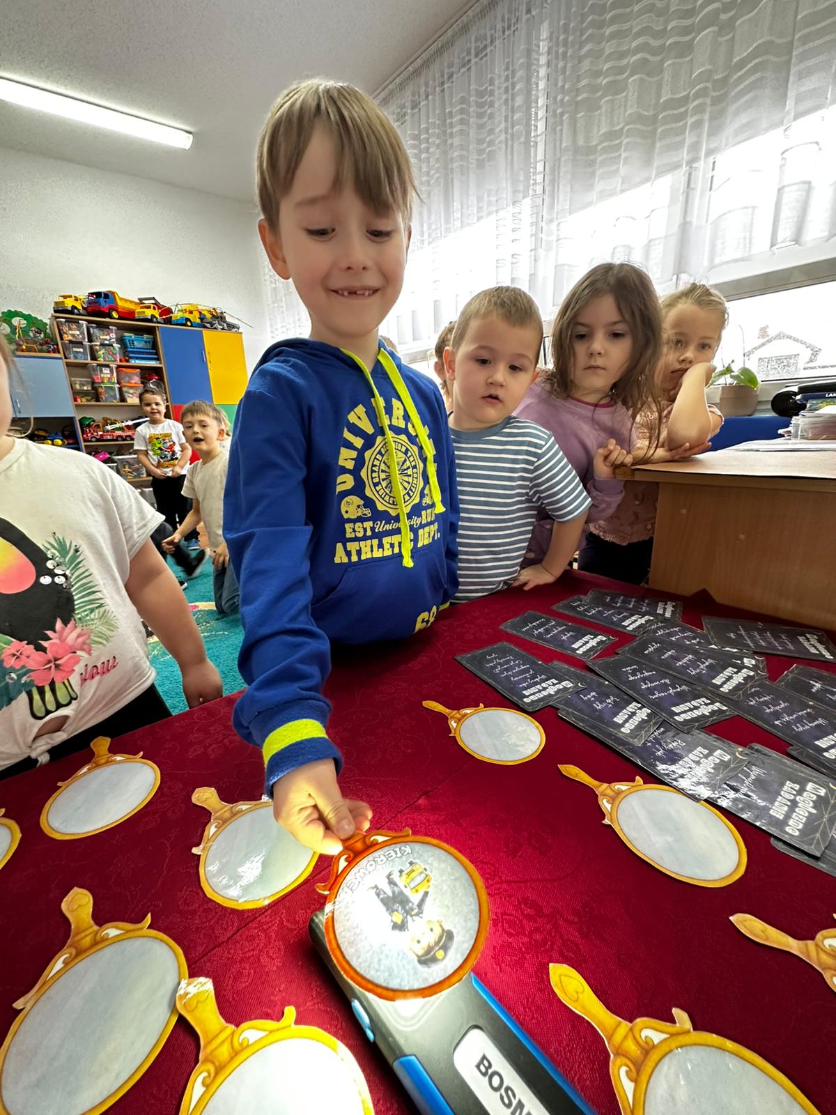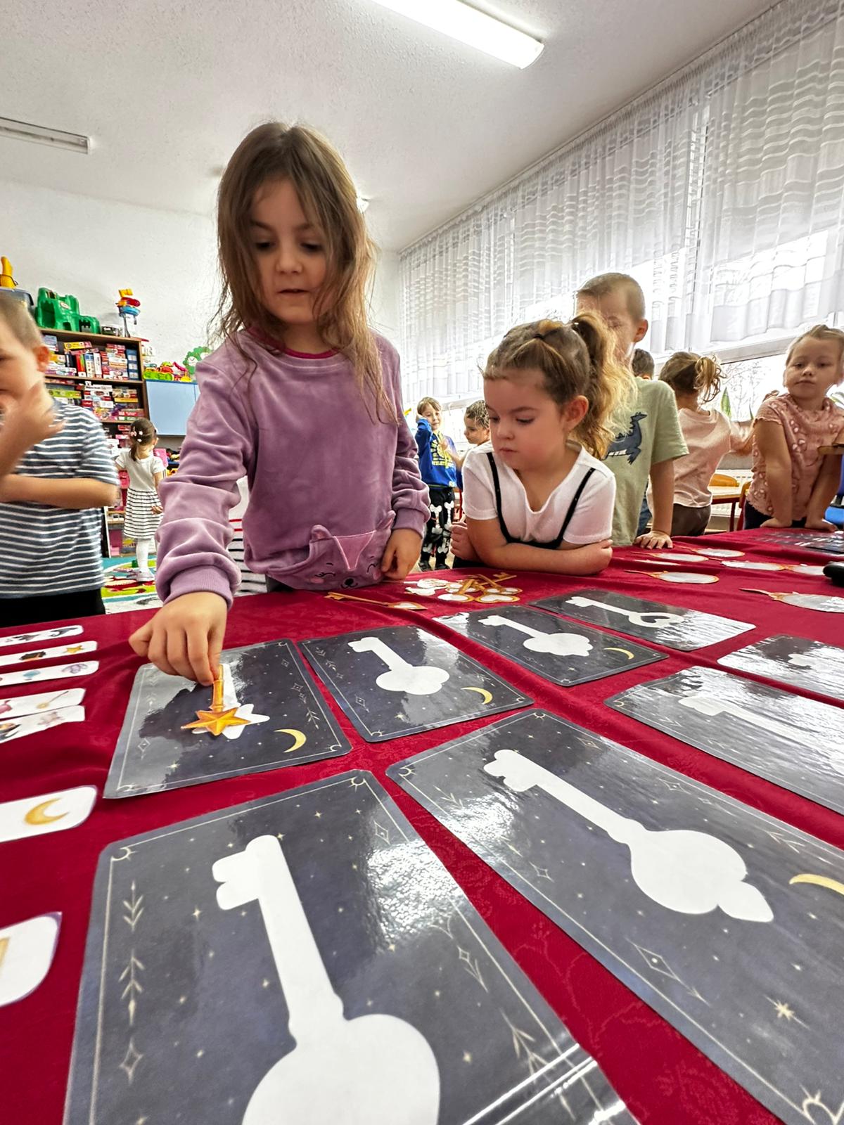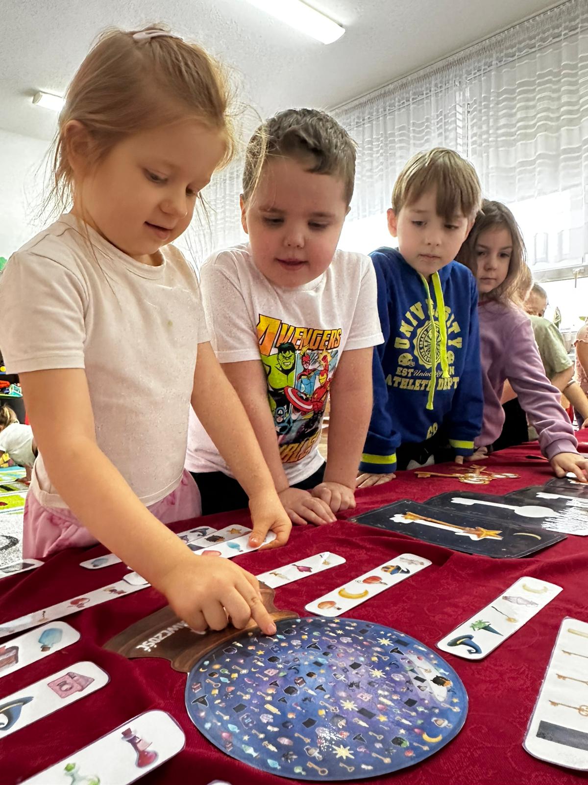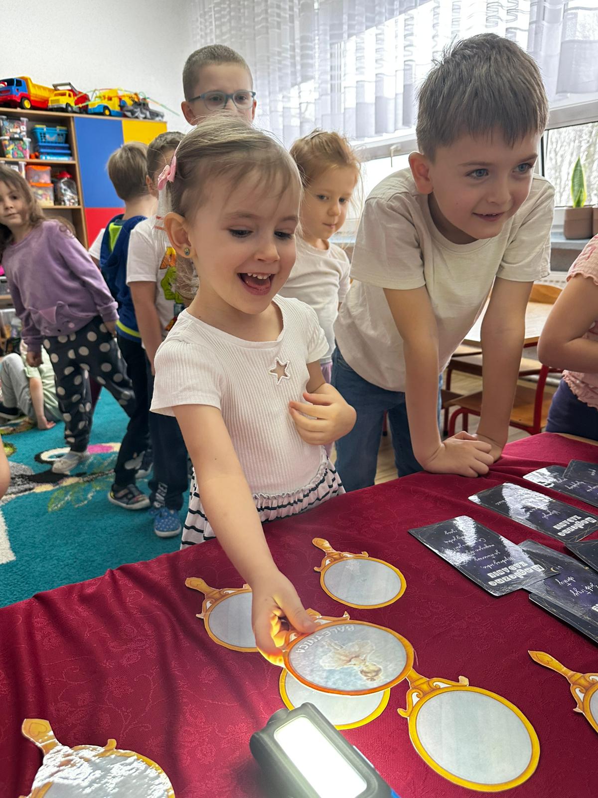 Dzieci wróżyły przyszłe zawody, zaglądając do magicznego lusterka, a następnie wykonywały zadania z tajemniczych kart, które prowadziły je przez kolejne etapy zabawy. Nie zabrakło również dopasowywania kluczy do właściwych drzwi, co wzbudziło wiele emocji i śmiechu. Był to dzień pełen radości, ciekawości i wspólnej zabawy. Dziękujemy dzieciom za zaangażowanie, a rodzicom za pomoc w przygotowaniu słodkiego poczęstunku!